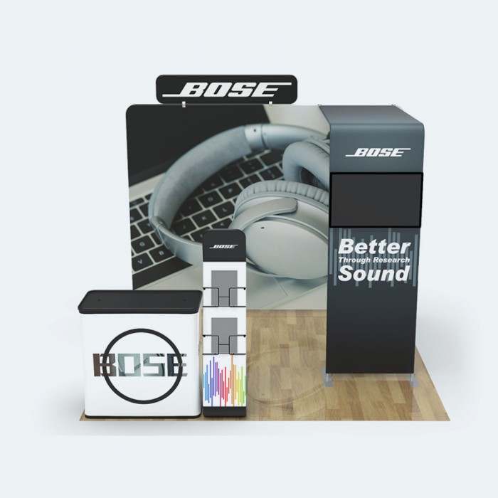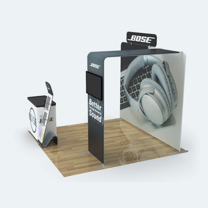 Featuring a flat tension fabric backwall display, a tension fabric header, a literature and brochure stand, a television monitor bracket and display stand, and a podium (with included carrying case), this unique booth has the ability to engage any audience.